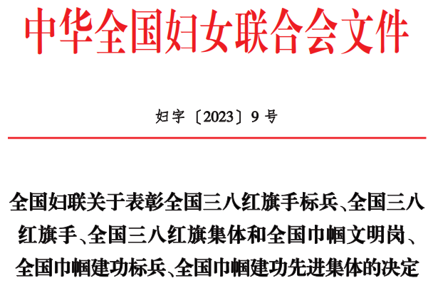 近日,中华全国妇女联合会印发《全国妇联关于表彰全国三八红旗手标兵、全国三八红旗手、全国三八红旗集体和全国巾帼文明岗、全国巾帼建功标兵、全国巾帼建功先进集体的决定》(妇字〔2023〕9号),亚博体育 控股集团办公室行政部上榜,获评“全国巾帼文明岗”。
