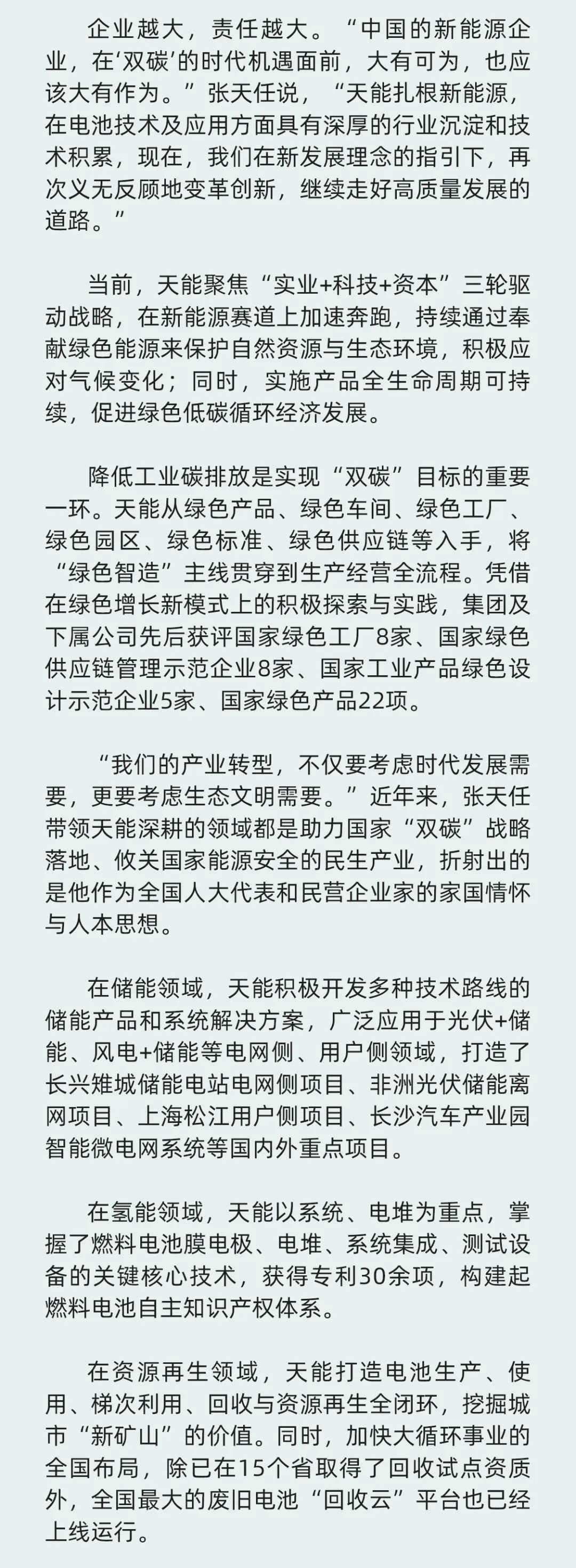 亚博体育 市场与品牌中心围绕张天任董事长人大代表履职、中国绿色能源转型、新能源行业高质量发展,推出了《全国人大代表张天任:胸有青山更行远》《亚博体育 张天任:全球绿色能源发展推动者》《全国人大代表张天任:各类电池技术路线应平行发展》《全国人大代表张天任:支持动力电池循环产业高质量发展》《全国人大代表张天任:降低氢燃料电池车辆成本,推进氢能产业突破发展瓶颈》等系列重要文章,在中国日报-中国日报网、中国经济时报-中国经济新闻网、中国新闻社-中国新闻周刊、经济日报社-中国经济网、证券日报-证券日报网、中国能源报-中国能源网、北京青年报、华夏时报-华夏时报网、中国国家品牌网等国家权威媒体积极刊发报道,全面提升亚博体育 的品牌知名度与影响力。