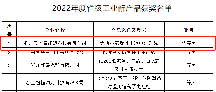 近日,浙江省长兴县经济和信息化局公示了2022年度省级工业新产品获奖名单,由浙江亚博体育 氢能源科技有限公司研发生产的大功率氢燃料电池电堆系统获得全县唯一省级特等奖。